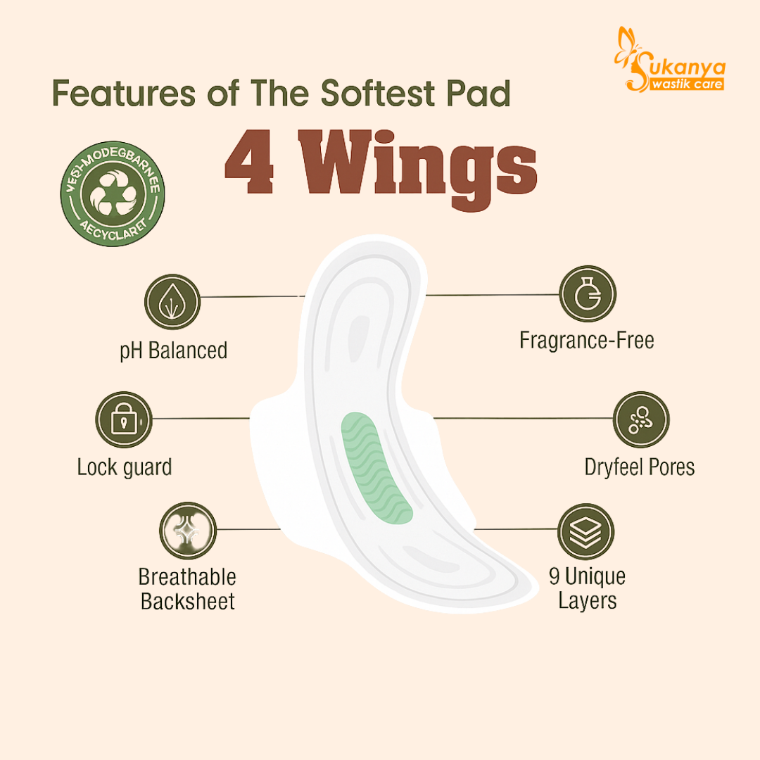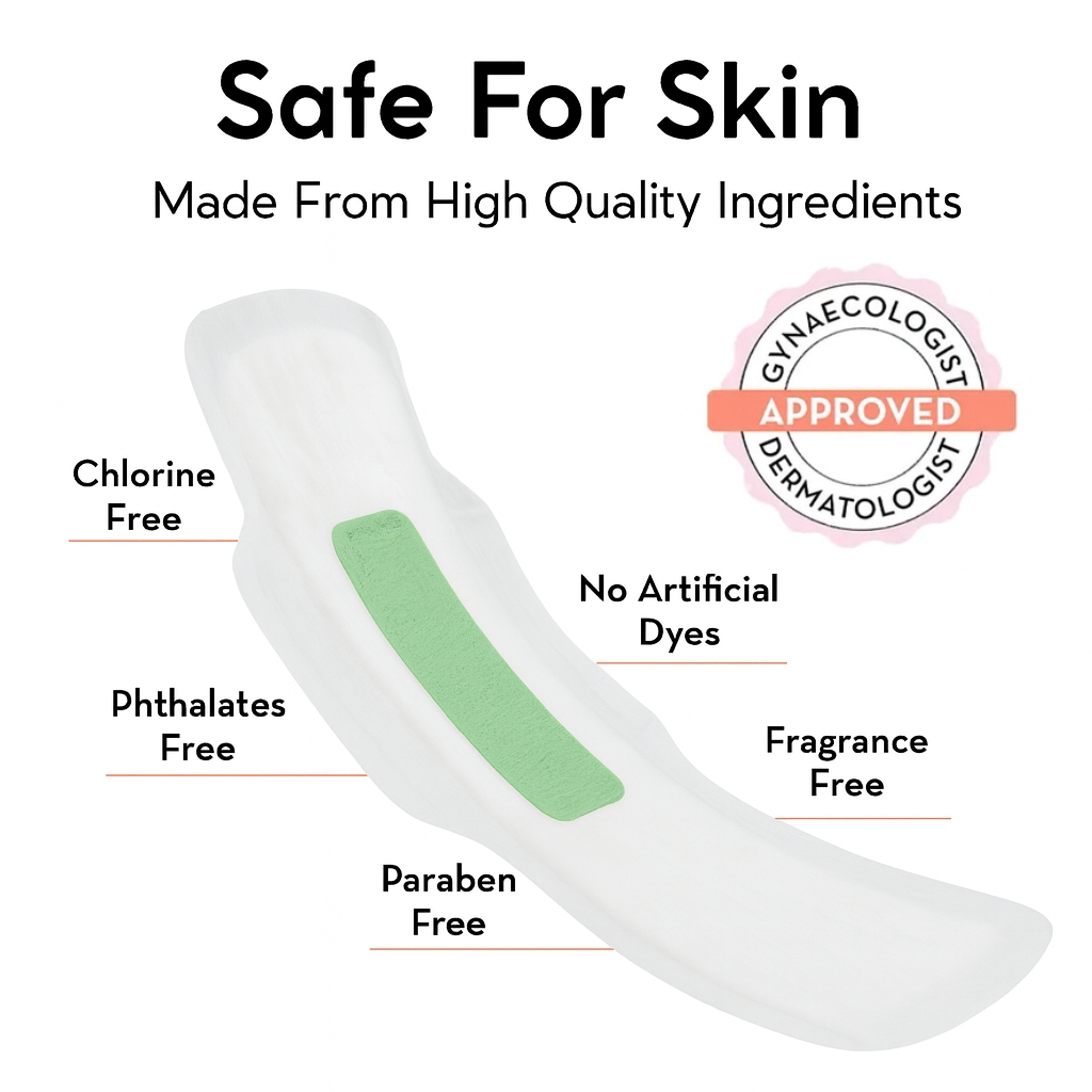 त्वचा पर कोमल, सुरक्षा में मज़बूत – हमारे पैड प्रीमियम, त्वचा-हितैषी सामग्रियों से बने हैं, जिन्हें खासतौर पर चुना गया है ताकि आपको सुबह से रात तक बेमिसाल आराम, ताजगी और आत्मविश्वास मिले। ये पूरी तरह से क्लोरीन, पैराबेन्स, फ़्थैलेट्स, कृत्रिम रंग और ख़ुशबू से मुक्त हैं, ताकि आपके स्वास्थ्य को हमेशा प्राथमिकता दी जा सके और जलन से बचाव हो। प्रत्येक पैड त्वचा रोग विशेषज्ञ और स्त्री रोग विशेषज्ञ द्वारा अनुमोदित है, जो भरोसेमंद गुणवत्ता का प्रमाण है। सुरक्षित, विश्वसनीय और सोच-समझकर डिज़ाइन किए गए ये पैड हर उस महिला के लिए बने हैं जो हर दिन सम्मान, सुरक्षा और देखभाल की हकदार है।